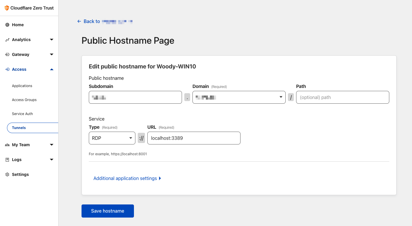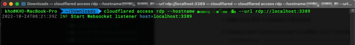 cloudflared access rdp --hostname <YOUR HOSTNAME> --url rdp://localhost:3389