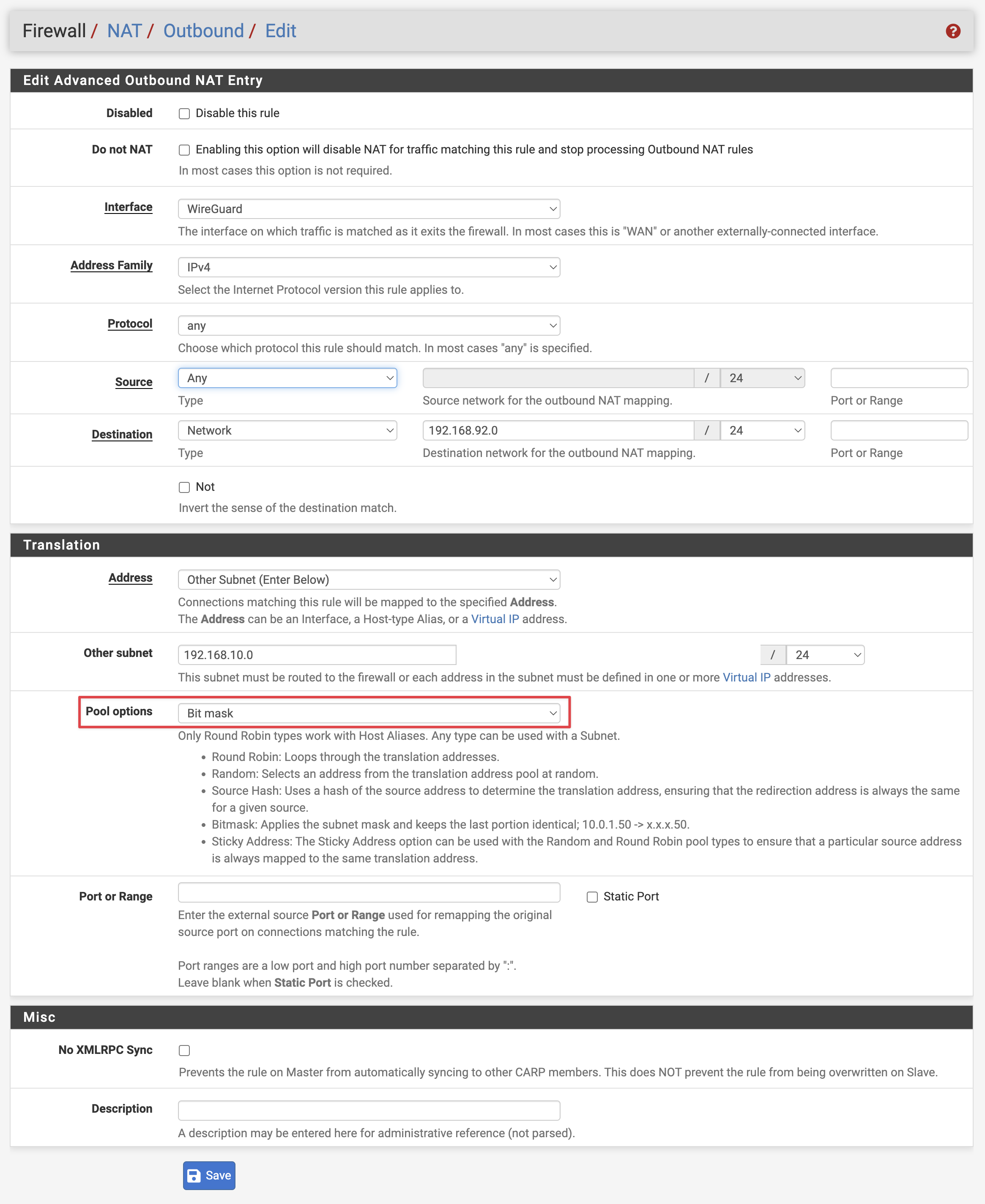 Traffic destined to 192.168.92.0/24 needs it’s source to be rewritten to an address in the 192.168.10.0/24 network. I’m using Bitmask to keep the last portion of the address identical during translation, it makes it a lot easier when looking at firewall logs.