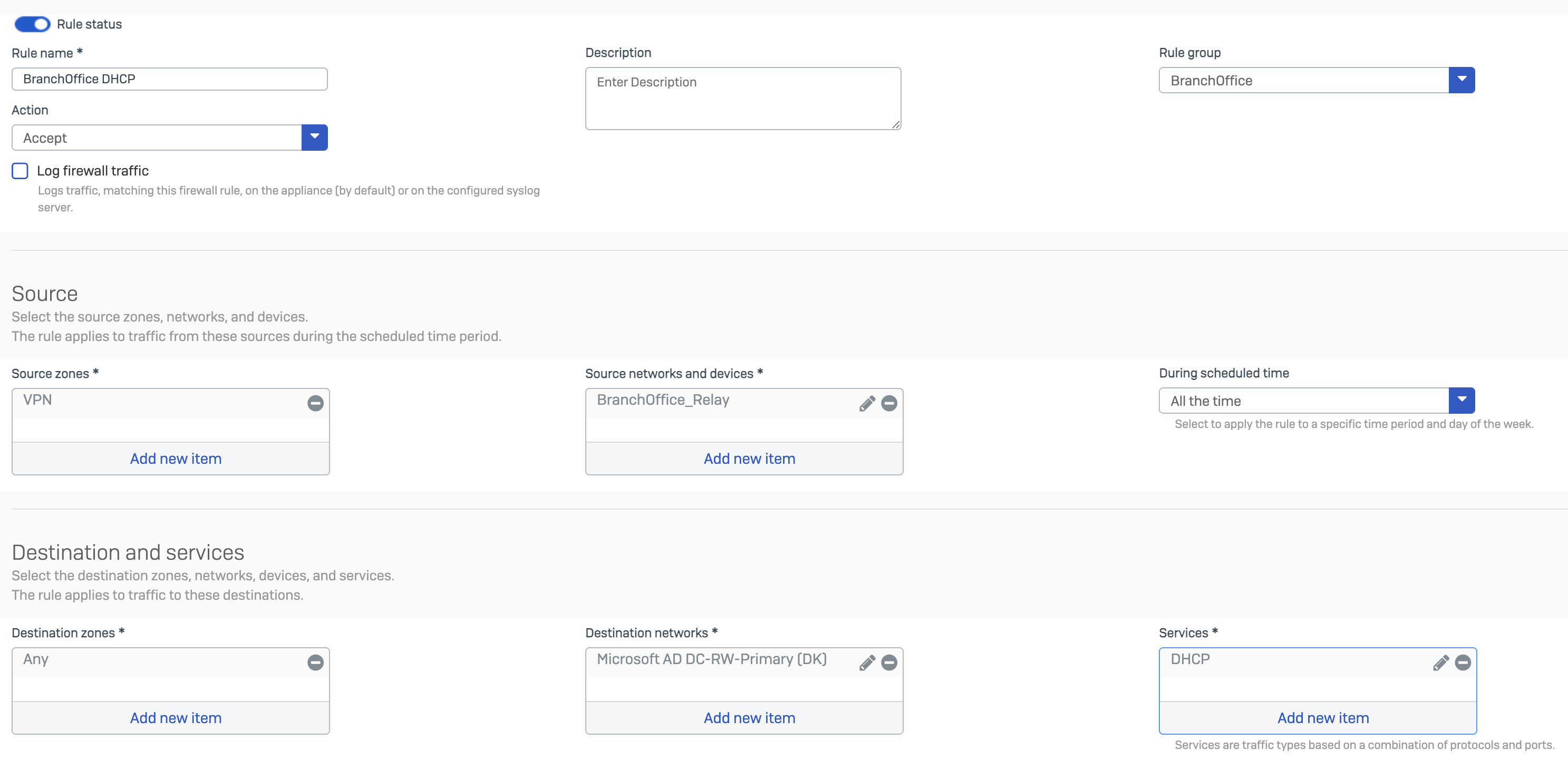 Rule 1: Permits DHCP relay traffic from the Branch Office firewall to the DHCP server located in the HQ network, allowing DHCP Discover and Request messages to be forwarded appropriately.