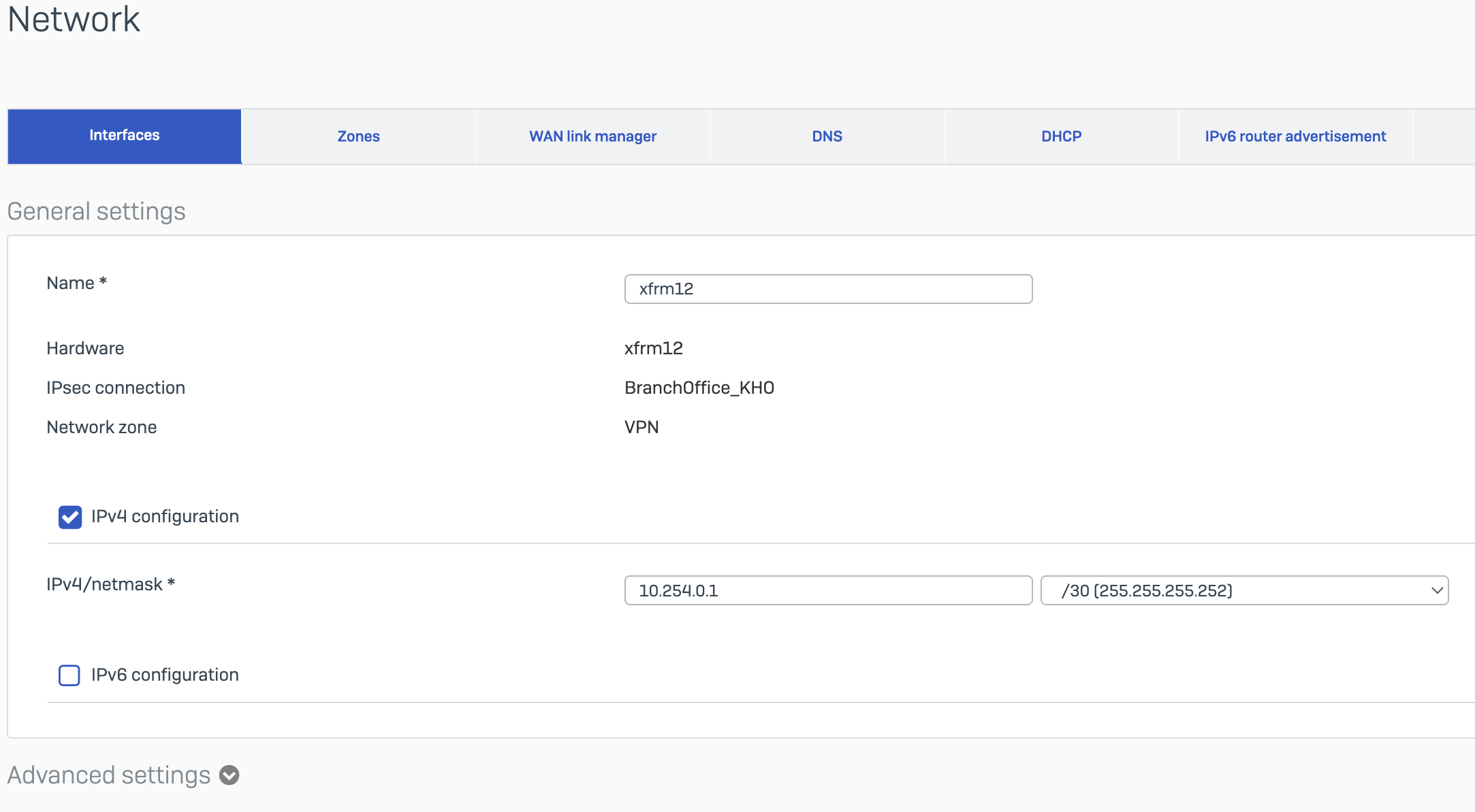 Name Headquaters IP Version IPv4 Connection Type Tunnel interface Gateway type Responder Profile IKEv2 Authentication Type RSA Key — — Listening interface Port2 - 1.1.1.1 Local ID Type IP adddress Local ID 1.1.1.1 Local Subnet Any — — Remote Gateway address 2.2.2.2 Remote ID Type IP adddress Remote ID 2.2.2.2 Remote Subnet Any